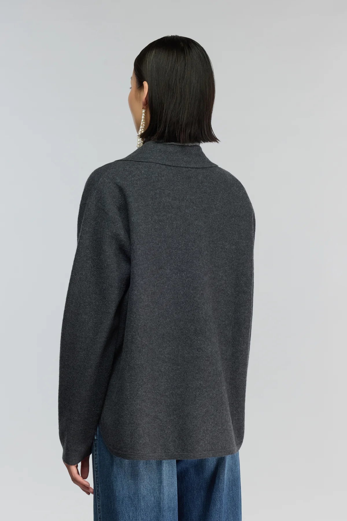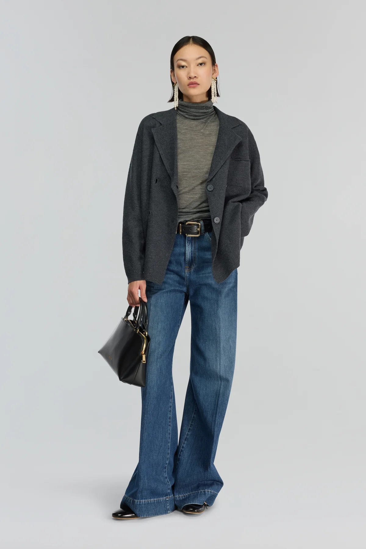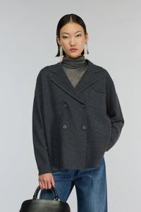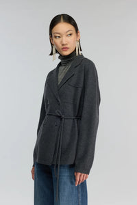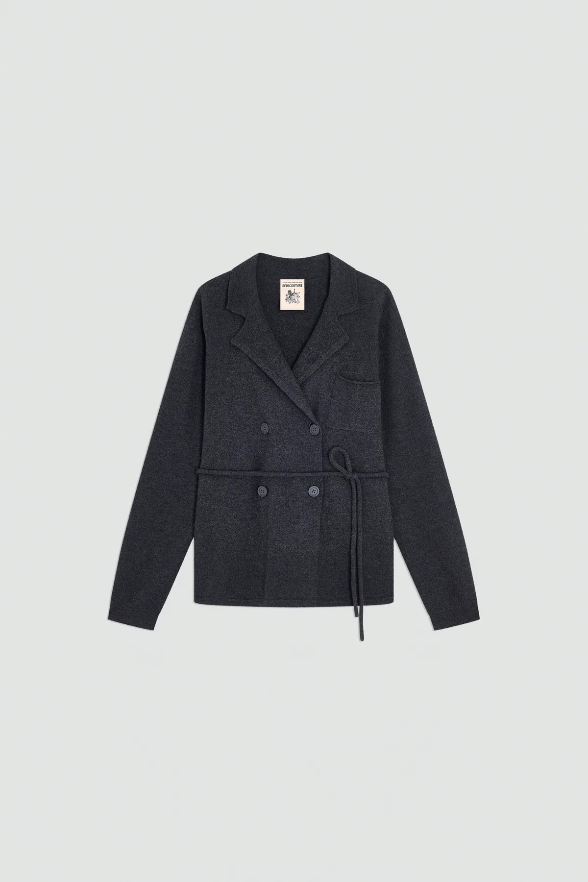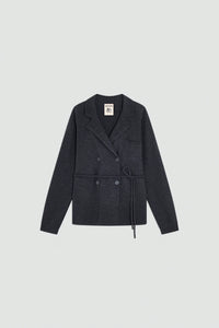 Giacca in lana cotta. Modello doppio petto con rever, taschino applicato sul petto. Cintura inclusa nel capo. Vestibilità regular, lunghezza bacino.